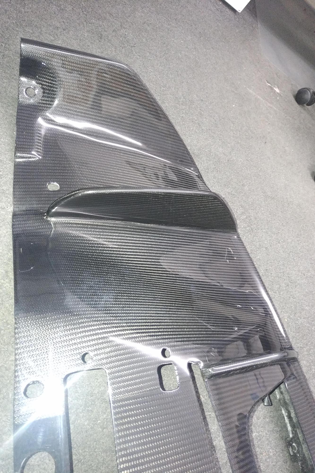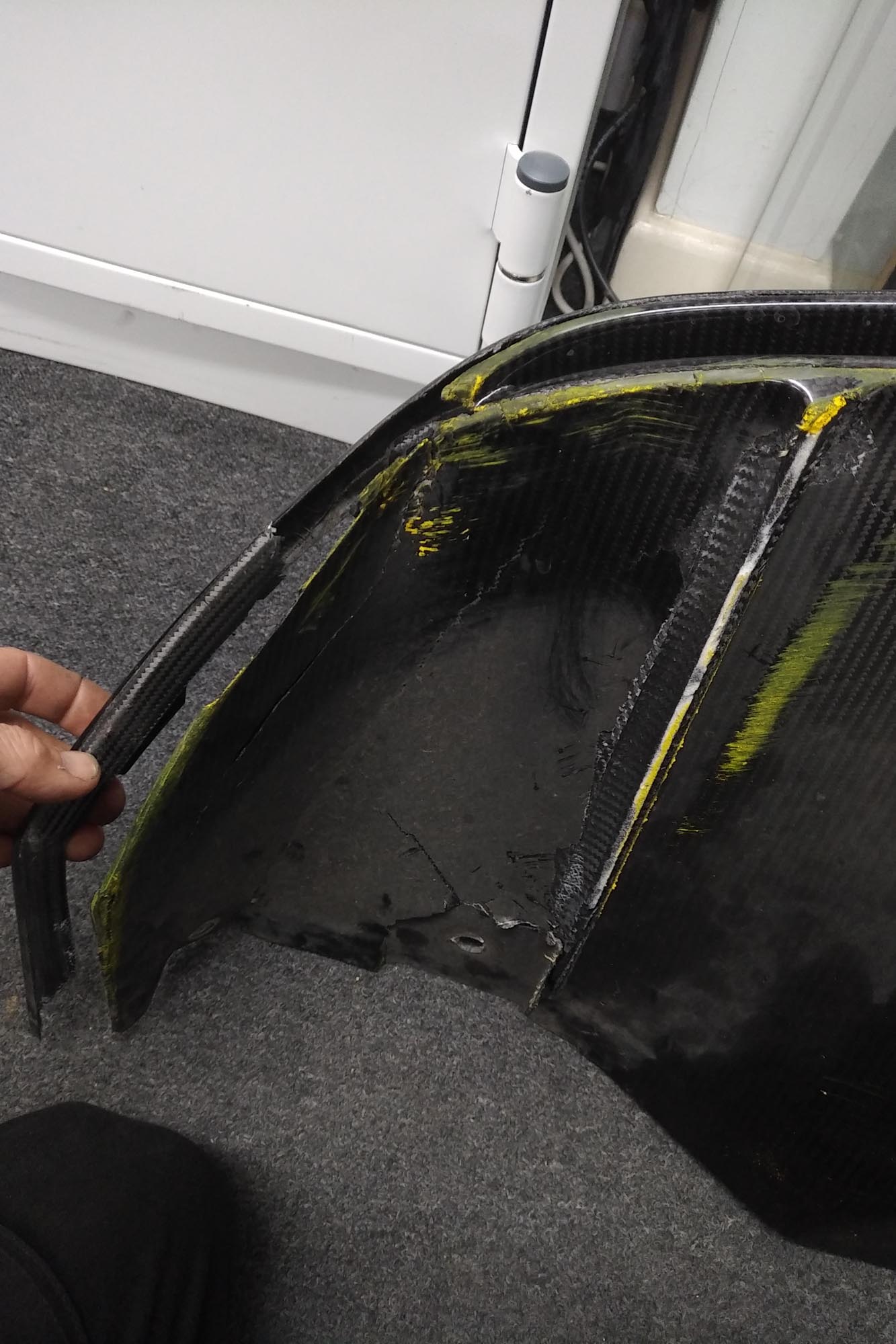 Customer Damaged Audi R8 carbon rear diffuser after backing into a chain link fence, part cracked and 2k clear coat damaged. We removed the clear coat and repaired with new carbon and re clear coated to an almost invisible repair.