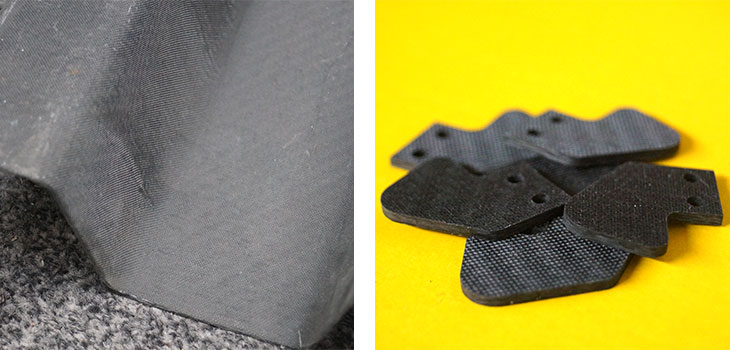 If a smoother B-surface finish is required, then peel ply can be added to provide a wrinkle free textured surface (image below, left). If desired, peel ply can be used as an A-surface finish also. A typical application would be for steering wheel paddles where the texture of the peel ply provides extra grip (image below, right);