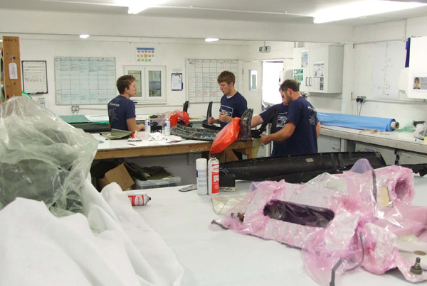 In the 880Sq ft clean room the manufacturing process begins. Sales orders that have been inputted to the computerised MRP system appear on the clean room work station and visual planning in priority order. Kits will have been pre-cut and materials pre assigned and logged for traceability. The laminator with the correct skill grade for the complexity of the part, can then focus on laminating the right issue part in the right issue mould tool. Plys and vacuum bagging are cross checked by another employee of the same or higher skill level. Barcoded tracibility part stickers are laminated and cured into the components.